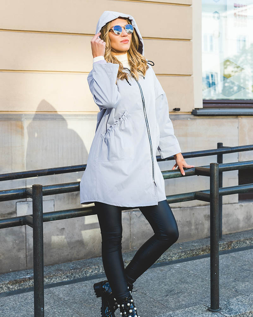 Gaiši pelēka sieviešu jaka ar kapuci- Apģērbi