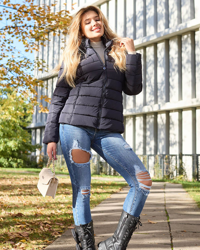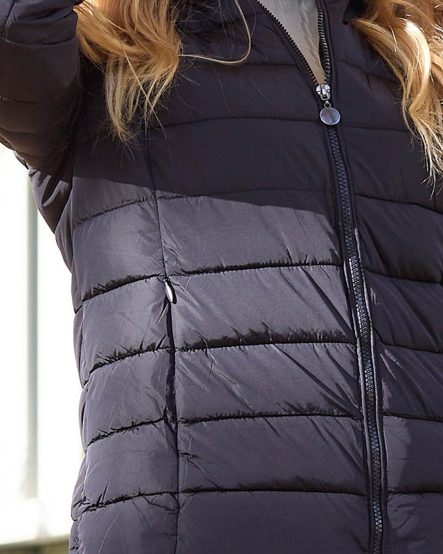 Tumši zila dūnēta sieviešu jaka ar kapuci un kažokādu - Apģērbi