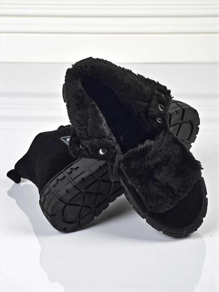 Scarpe da donna nere, realizzate in pelle ecologica scamosciata di alta qualità, che garantiscono comfort e un look alla moda. Grazie all'utilizzo di una soletta in lana, i piedi rimangono caldi anche nelle giornate fredde. L'altezza della suola è di 4 cm, il che aggiunge centimetri sottili senza sacrificare il comfort. La tomaia con un'altezza di 10,5 cm e una larghezza di 12 cm (per la taglia 38) fa sì che le scarpe si adattino perfettamente a ogni piede.