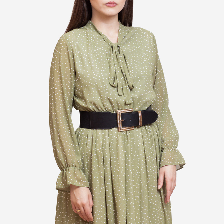 - Mega stilīga sieviešu josta melnā krāsā, izgatavota no eko ādas un gumijas kombinācijas. Modelis aizdares ar lielu zelta sprādzi. Skaists papildinājums jebkuram stilam!
