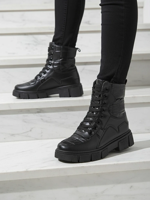 - Doskonałe damskie sznurowane botki a'la workery, cholewka wykonana jest z połączenia skóry ekologicznej oraz sztucznego materiału a'la cerata z pikowanym wykończeniem. Środek wyłożony tkaniną. CZARNE NIEOCIEPLANE BOTKI TRAPERY QERTERA