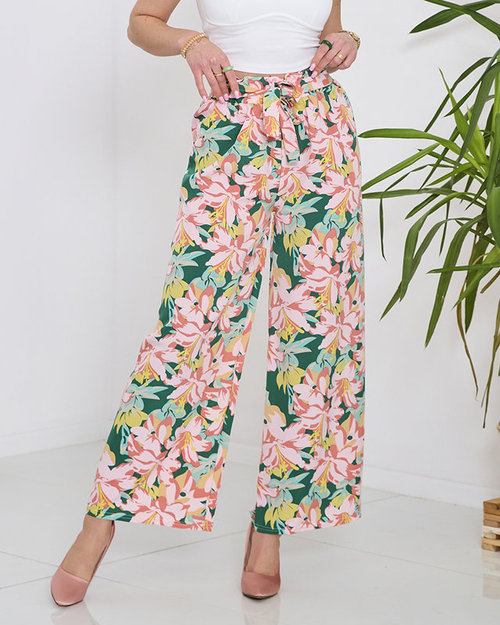 Sieviešu zaļas palaco bikses ar rozā ziediem - Apģērbs