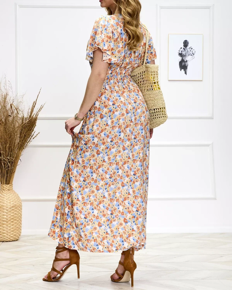 Oranžā un zilā krāsā sieviešu puķaina midi kleita - Apavi