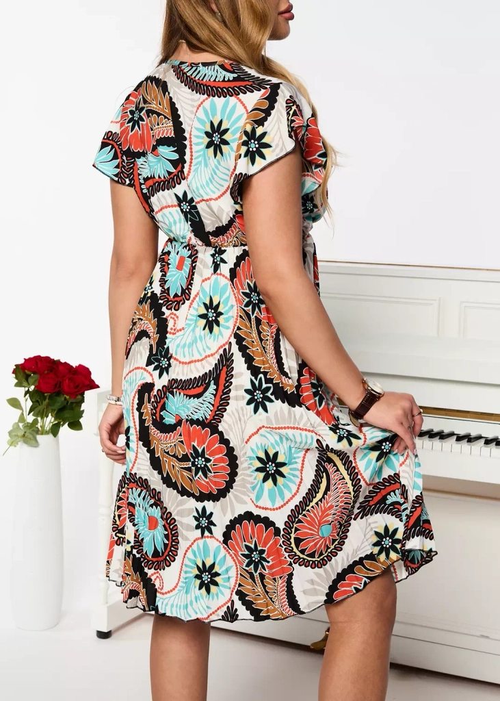 - Sieviešu vasaras kleita līdz ceļgaliem, no viegla plisēta auduma. Modelis ar aplokšņu izgriezumu un īsām piedurknēm. Lieliski sader ar sandalēm! PIEZĪME: mērījumu precizitāte (+/-) 1 cm.