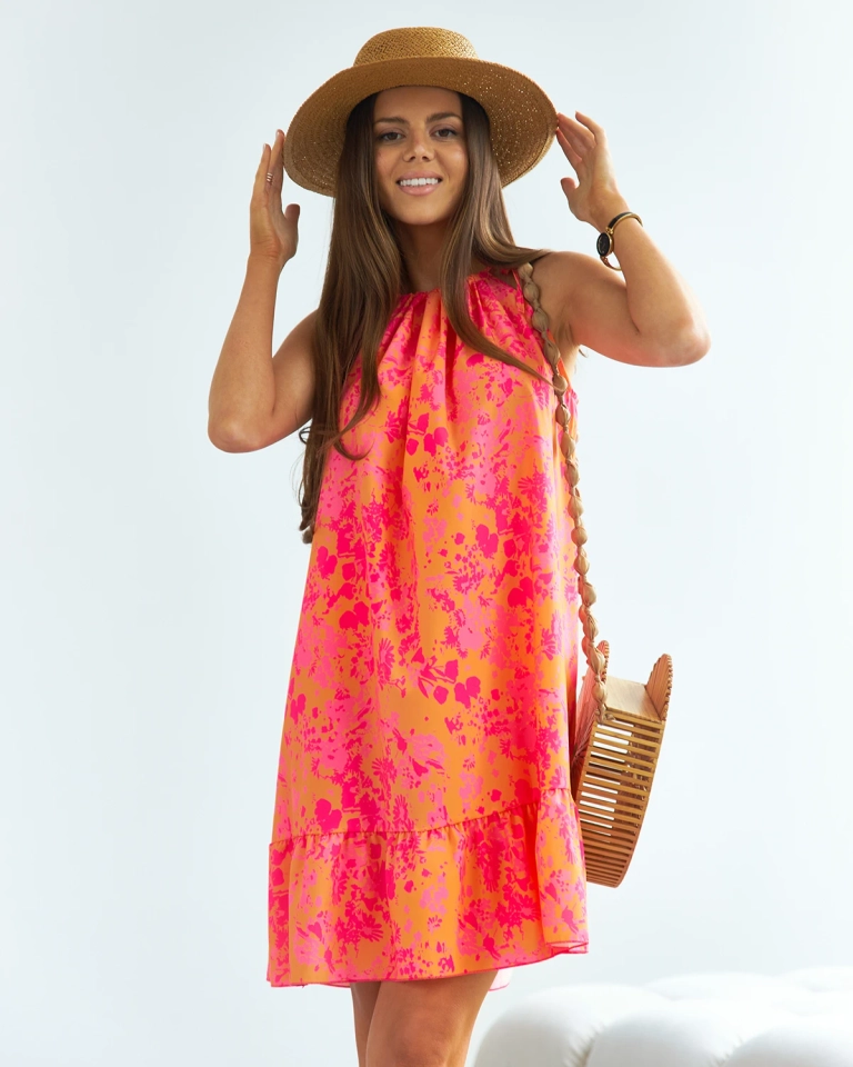 Royalfashion Oranži-rozā sieviešu īsa kleita ar ziediem