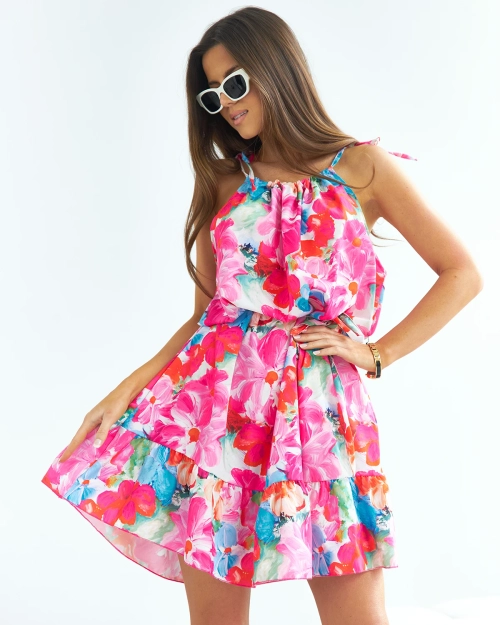 - Viegla sieviešu īsa kleita ar krāsainu rakstu. Modelis bez siksniņām, ar apaļu un regulējamu izgriezumu. Kleitas apakšdaļa ir ar volānu. Turklāt tai ir plāna auduma josta. PIEZĪME: Mērījumu precizitāte (+/-) 1 cm