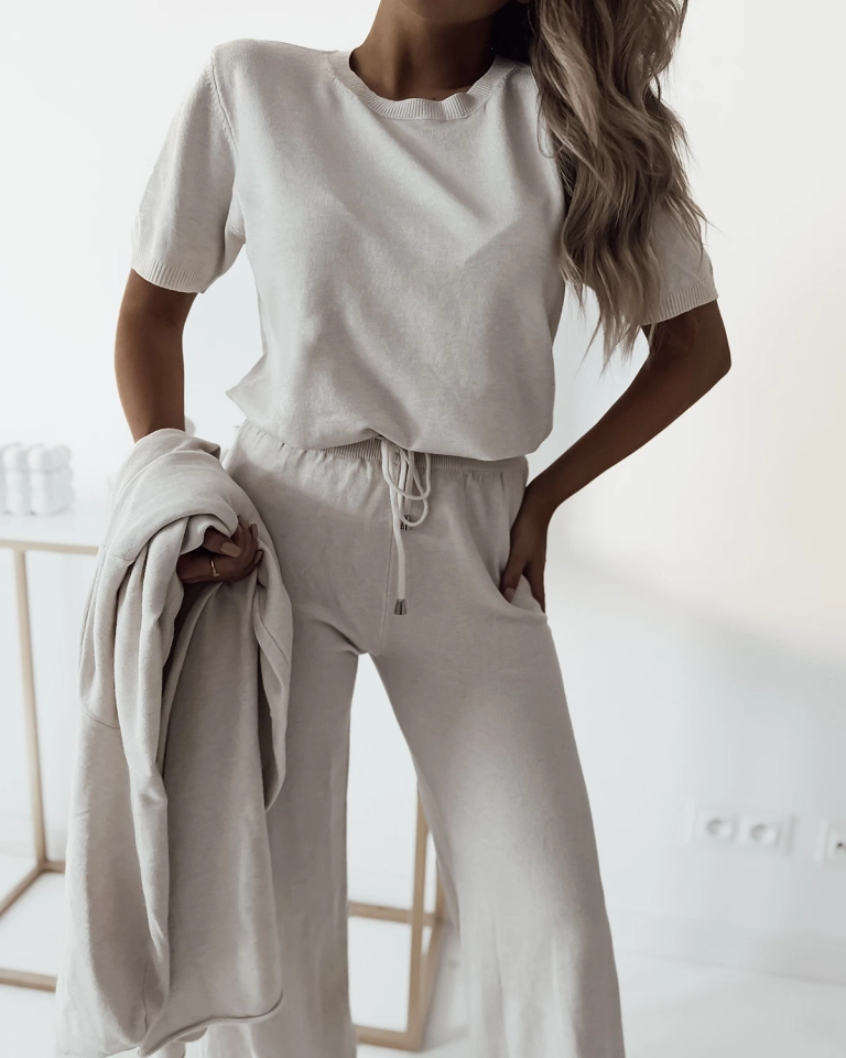 - Atklāj absolūtu komfortu un stilu šajā 3 daļu komplektā. Tas sastāv no kardigāna ar kapuci un kabatām, platām auduma biksēm un džempera ar īsām piedurknēm - visi no patīkama auduma. PIEZĪME: Mērījumu precizitāte (+/-) 1 cm