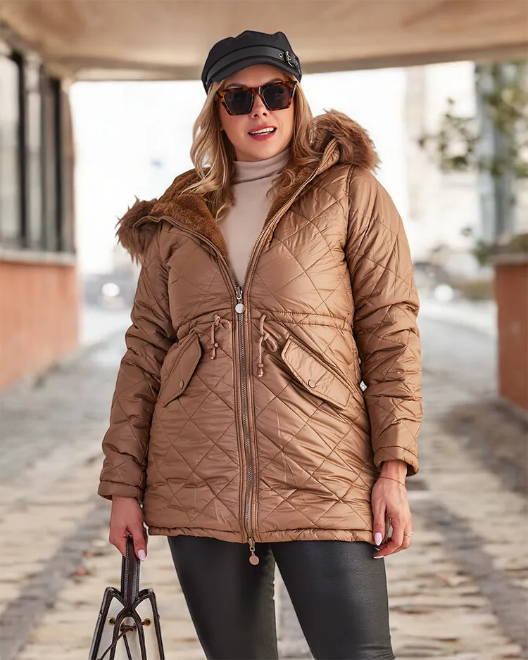 - Sieviešu stepēta jaka pirms ceļgala. Šim modelim ir kapuce ar kažokādu un divas kabatas. Jaka ir aizdare ar rāvējslēdzēju. Modelis ir siltināts ar kažokādu apakšpusē, un tam ir savelkama aukliņa viduklī. Tā būs lieliski piemērota rudens laika apstākļiem.