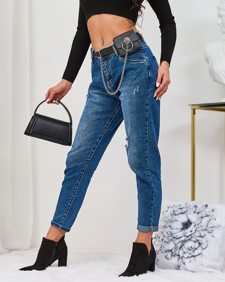Royalfashion Zili sieviešu mom džinsi ar jostu un maisiņu