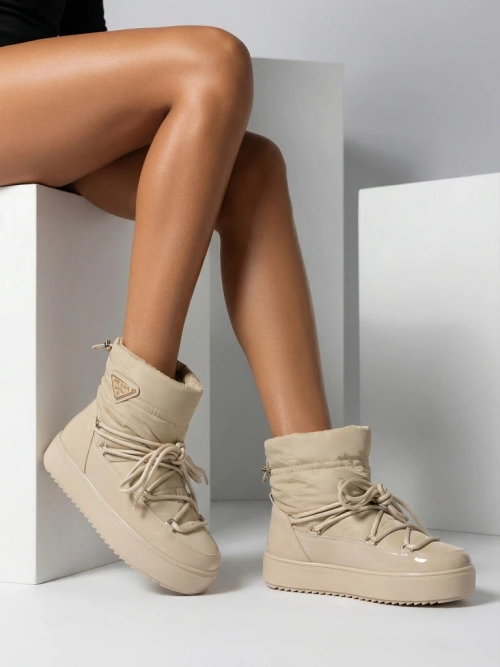 - Sieviešu sniega zābaki, kuru augšdaļa izgatavota no eko lakādas un a'la auduma kombinācijas. Izolēta iekšpuse no kažokādas, iešļūcamie apavi. Modelim ir apavu apavu augšdaļas galā iestrādāta valnīte. Ideāli piemērotas ziemai!