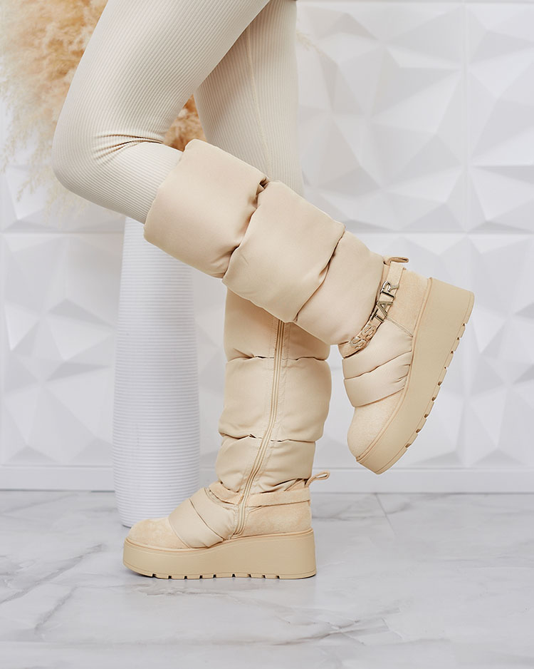 - Sieviešu platformas zābaki. Izgatavoti no ekoloģiskas zamšādas un siltināta auduma ap teļu, kažokādas zolīte iekšpusē. Modelis ar rāvējslēdzēju. Ideāla izvēle ziemas stilam!