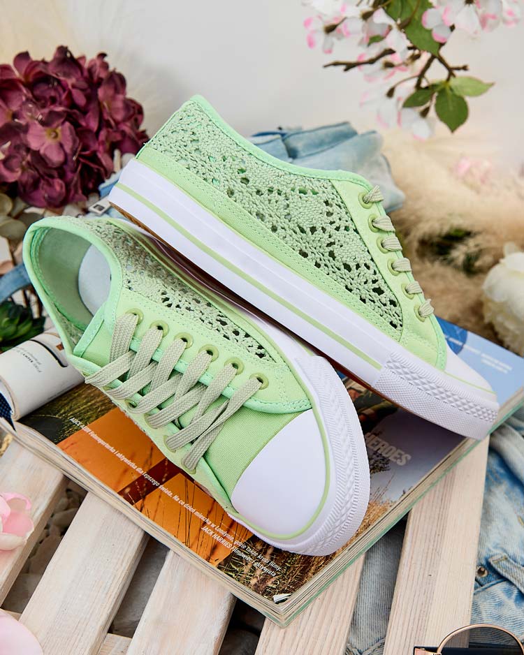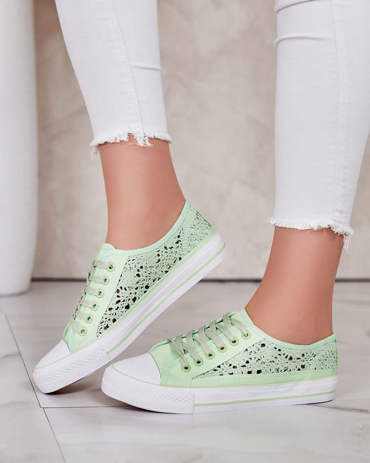 • Sieviešu apavi ar plakanu zoli. Ikdienas stila pāris ir izgatavots no auduma materiāla ar ažūru apdari, auduma zolīte. Modelim ir dekoratīvi izšuvumi. Ideāli piemērots tiem, kas novērtē komfortu!