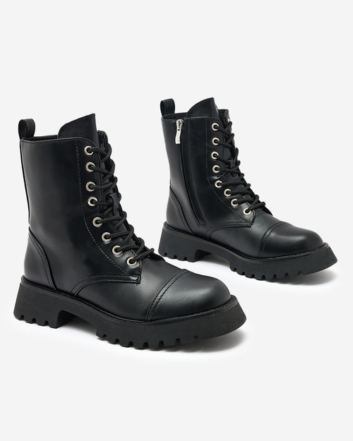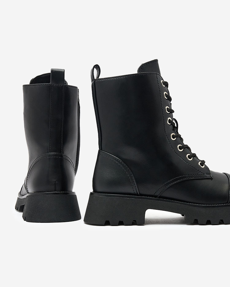 - Stilīgi bagger zābaki no eko ādas. Apavi ir ar mežģīnēm un rāvējslēdzējiem, tiem ir biezāka gumijas zole un kažokādas siltinājums. Lieliski piemērotas rudenim!
