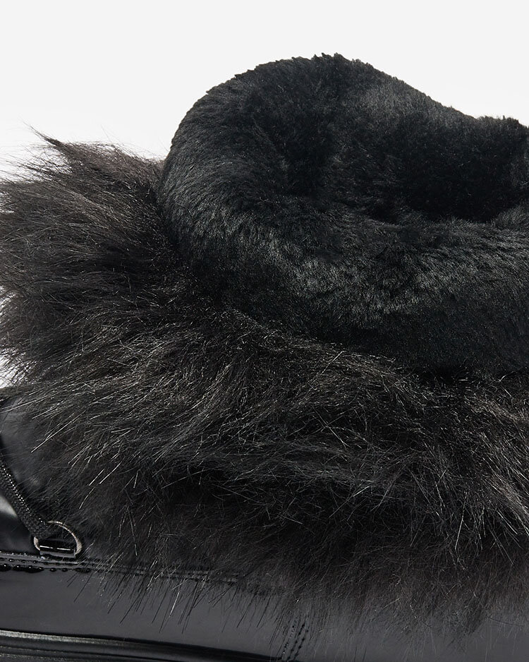 - Sieviešu sniega zābaki, kuru augšdaļa izgatavota no eko lakādas un a'la auduma kombinācijas. Iekšpusē siltinājums kažokādas veidā, kurpes šūrijas. Modelim ir kažoks augšdaļas galā. Ideāli piemērots ziemai!