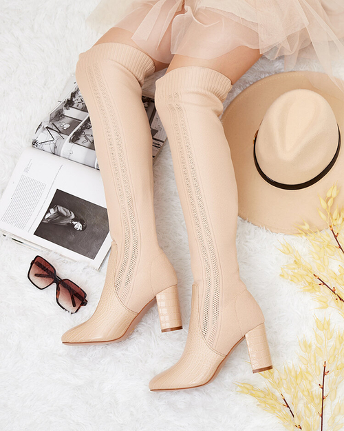 • Stilīgi sieviešu zābaki pāri ceļgaliem ar ielaidumu. Augšdaļa ir izgatavota no elastīga auduma materiāla, un tai ir eko ādas ielaidumi ar reljefu. Apavu iekšpusē ir auduma zolīte. Uzvelkams modelis.