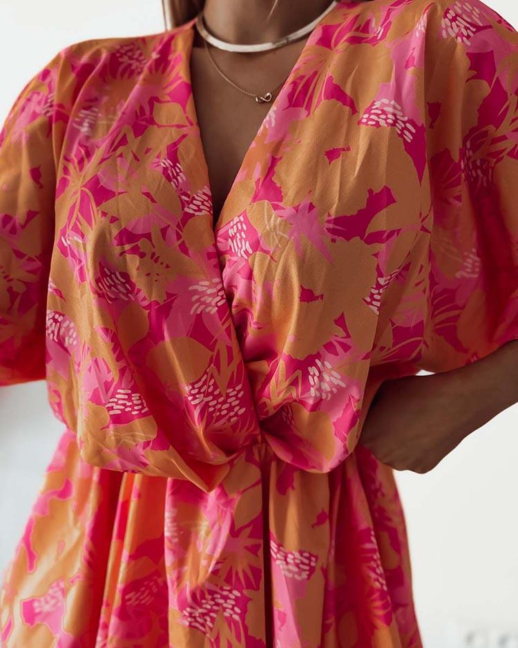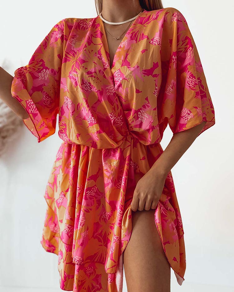- Skaista sieviešu mini kleita no viegla auduma ar oriģinālu rakstu. Vidukļa augstumā stiepjas elastīga gumija. Izstrādājumam ir īsas piedurknes, sirdsveida izgriezums un plats piegriezums.