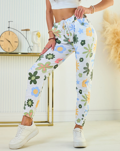 • Sieviešu konusveida bikses ar ziedu rakstu. Modelis ar vidēji garu vidukli, ar elastīgu lenti un saitēm viduklī, priekšpusē ir kabatas. Mode un komforts vienā!