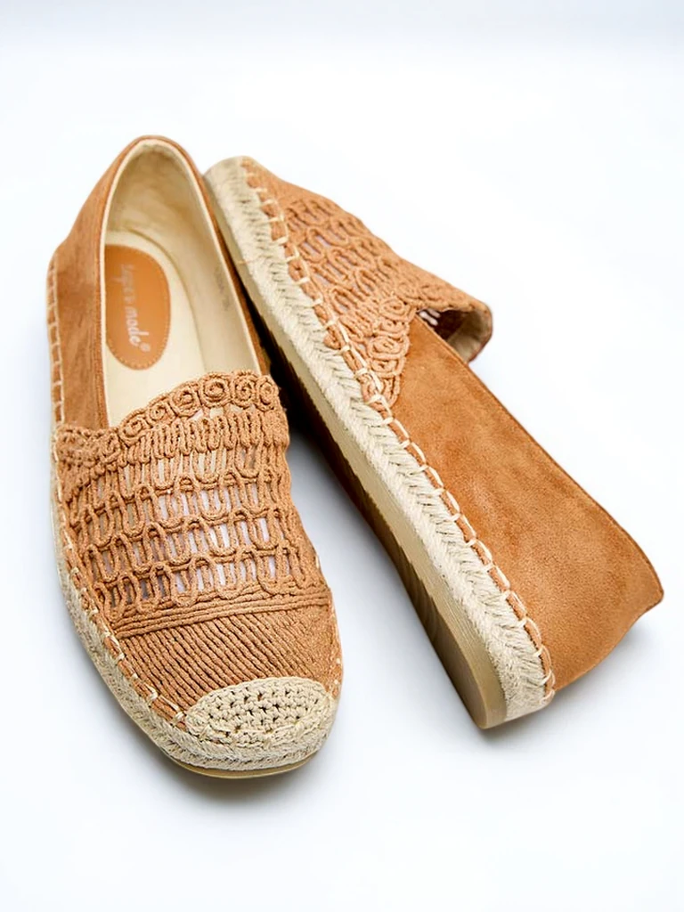 - Vieglas sieviešu espadrilles no eko zamšādas un auduma. Zoli rotā džutas aukla, bet mīkstā zole ir pārklāta ar auduma materiālu. Apaļais deguns ir ar ažūru apdari. Lieliski piemērotas vasarai!