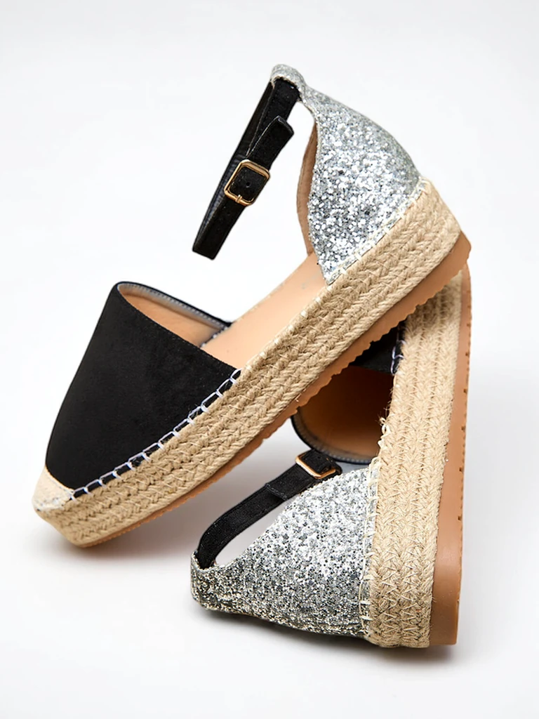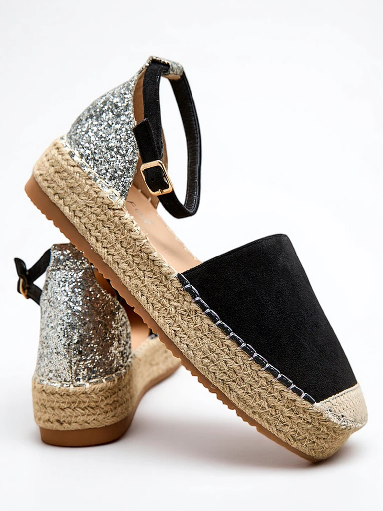 - Unikālas sieviešu espadrilles no eko zamšādas un auduma ar spīdumiem. Eko ādas zole. Plakanā zole rotāta ar džutas auklu komfortam. Aizdare ar sprādzi. Lielisks vasaras stila papildinājums!