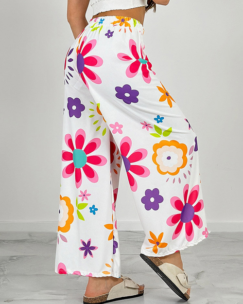 - Sieviešu platās bikses ar ziedu rakstu. Modelis ar vidēju vidukli, ar elastīgu joslu un saitēm viduklī, priekšpusē ir kabatas. Mode un komforts vienā!