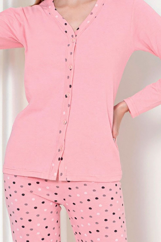 - Sieviešu divdaļīga pidžama no kokvilnas auduma, kas apdarināta ar dekoratīvu apdruku. Komplektā ir blūze ar garām piedurknēm un bikses ar elastīgu jostu un taisnām kājām.