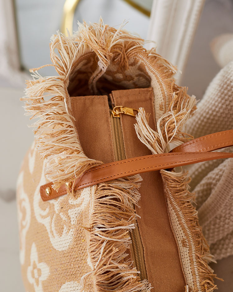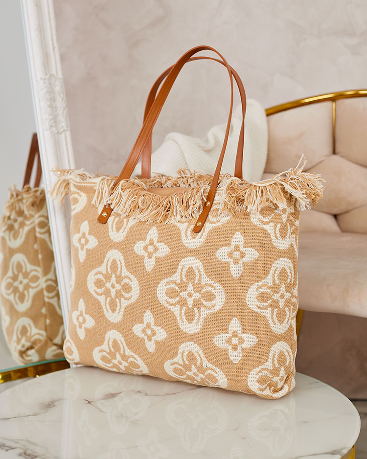 - Liela sieviešu somiņa no rakstaina auduma. Modelis ir ar 1 nodalījumu un rāvējslēdzēju. Lieliski piemērota ikdienai vai pludmalei!