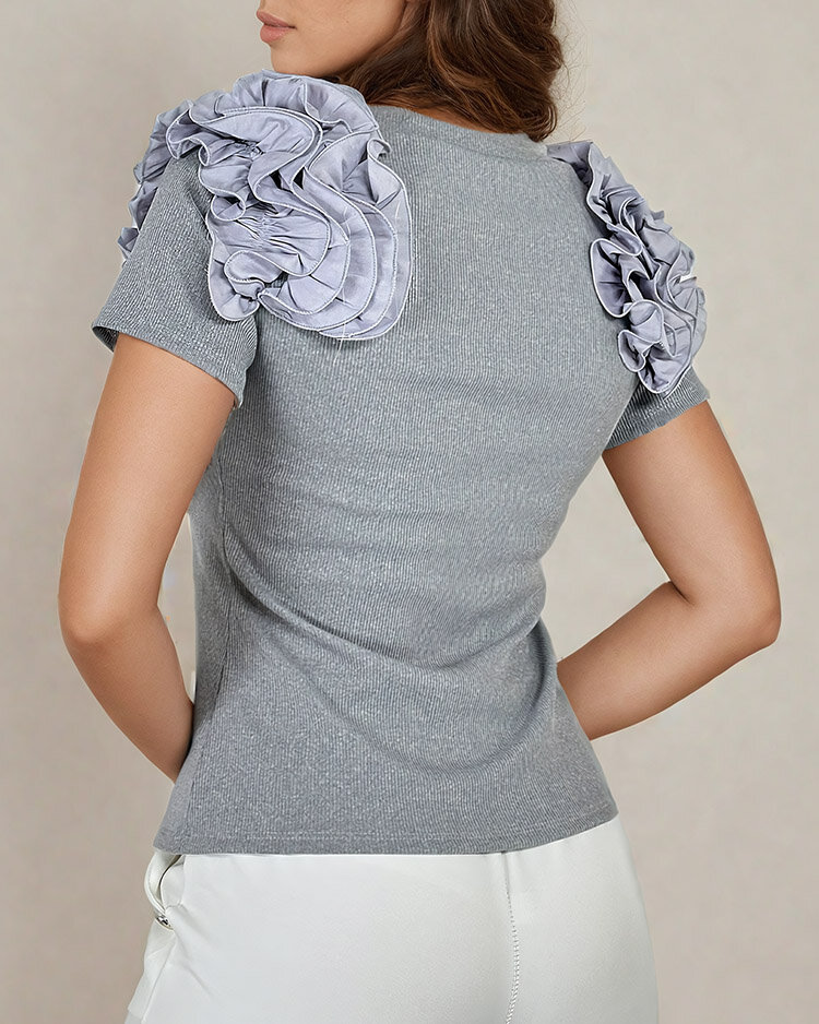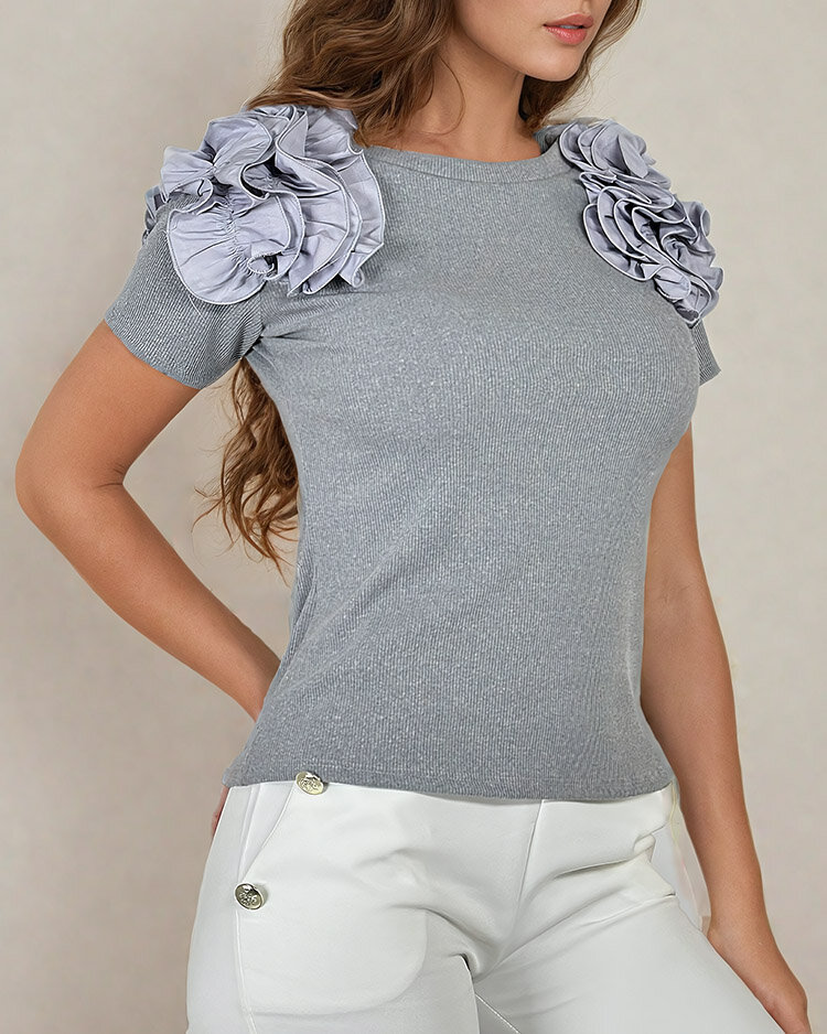 - Klasiska sieviešu blūze ar īsām piedurknēm, izgatavota no elastīga, ribota auduma. Blūze ir pieguloša piegriezuma, ar apaļu izgriezumu un dekoratīviem volāniem pie pleciem. PIEZĪME: mērījumu precizitāte (+/-) 1 cm.