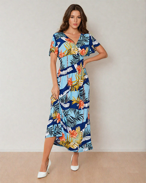 - Unikāla sieviešu kleita no viegla auduma. Midi garuma izstrādājums ar īsām piedurknēm un sirdsveida izgriezumu. Modeli rotā apdruka. Izjūtiet vasaru šajā modelī!