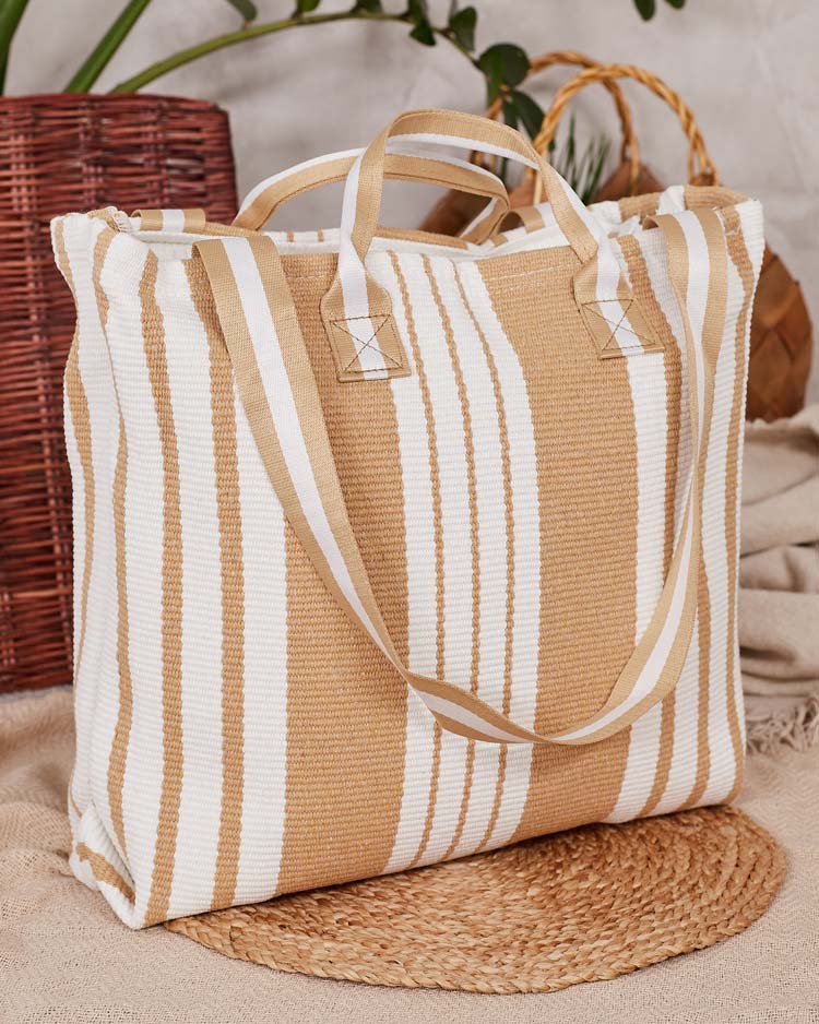 - Liela sieviešu somiņa no auduma ar svītrainu rakstu. Modelim ir 1 nodalījums, un tas ir aizverams ar rāvējslēdzēju. Lieliski piemērota ikdienai vai pludmalei!