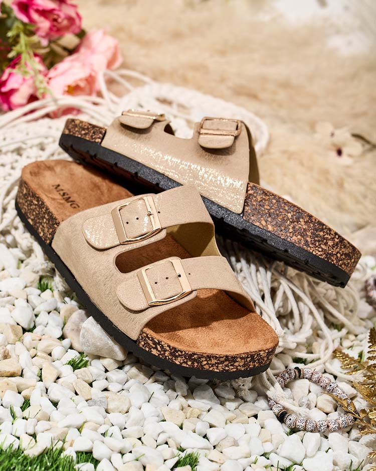 - Lieliskas sieviešu čības ar plakanu zoli. Izgatavotas tikai no ekoloģiskas ādas. To augšdaļā ir dekoratīvas sprādzes. Zoli rotā materiāls a'la korķis. Lieliska izvēle brīvdienām!