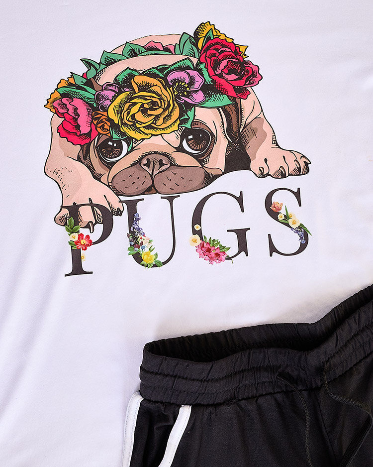 • Sieviešu komplekts no patīkama materiāla. Modelim ir apdruka ar suņuku. Blūze ar īsām piedurknēm un īsi šorti ar elastīgu jostu. Sajūtiet vasaru šajā brīnišķīgajā komplektā!