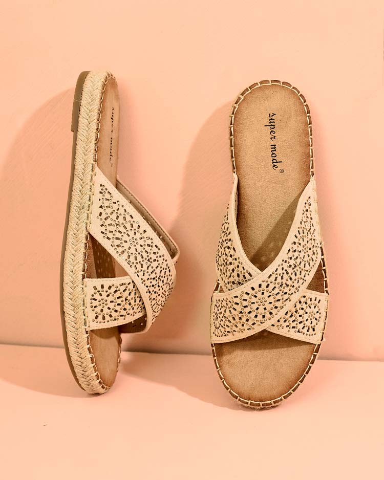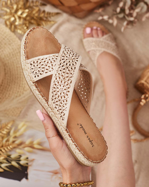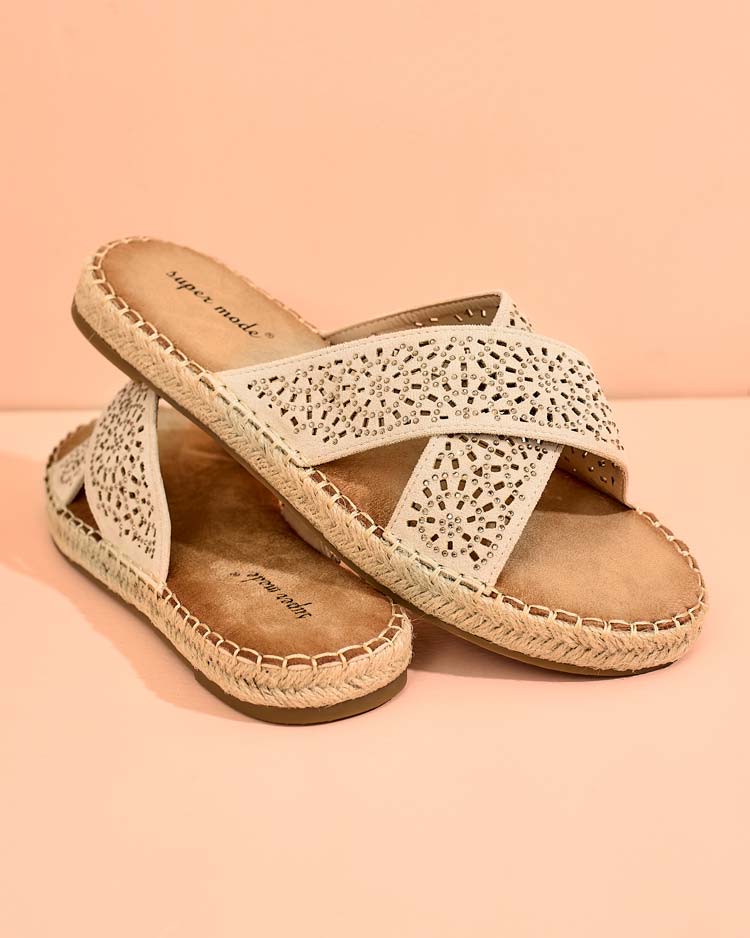 - Lieliskas sieviešu flip-flops ar plakanu zoli. Modelim ir ažūra augšdaļa no eko zamšādas, kas rotāta ar cirkoniem, un eko zamšādas lineāls. Zole apvilkta ar džutas auklu. Lieliska izvēle brīvdienām!