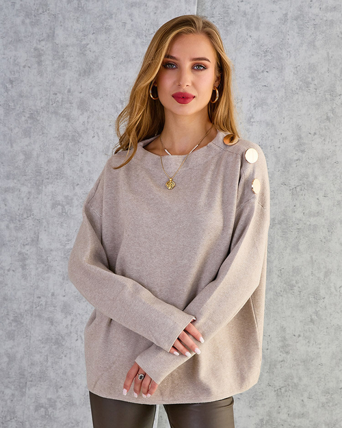 - Sieviešu džemperis ar apaļu izgriezumu, izgatavots no patīkama auduma. Modelim ir garas piedurknes un rotājumi uz pleciem. Šajā džemperī apvienots komforts un oriģināls stils.