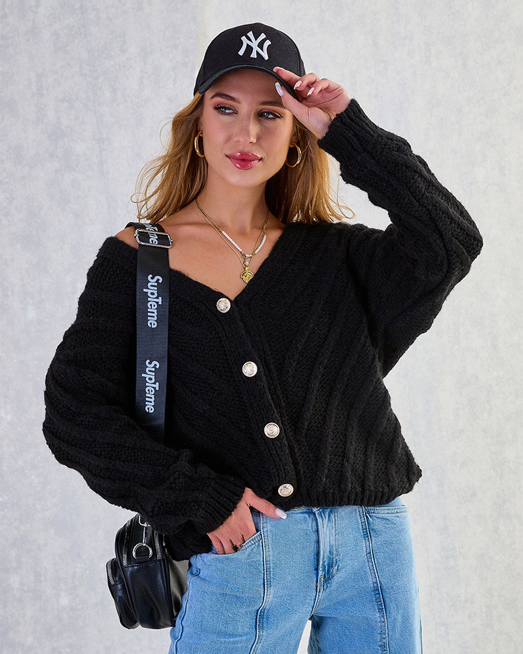 - Sieviešu džemperis ar sirdsveida izgriezumu, kas izgatavots no patīkama adīta auduma. Modelim ir dekoratīvas noņemamas pogas. Lielisks pamats vēsākām dienām!