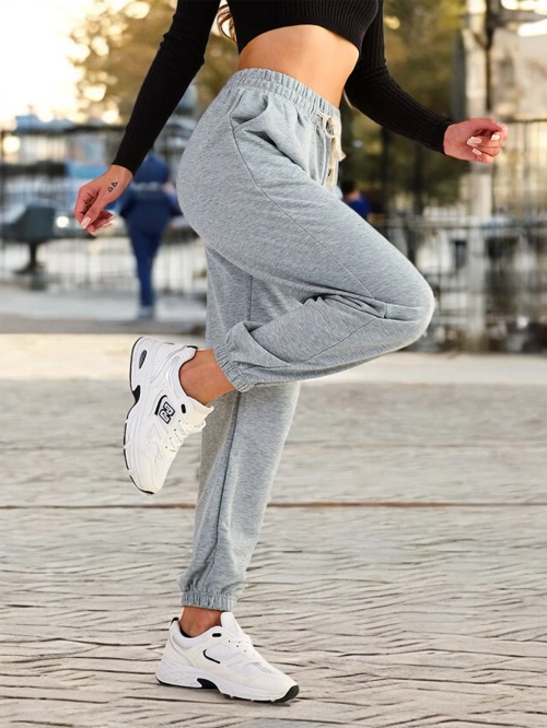 - Klasiskas treniņbikses no mīksta, viegla auduma. Plaša elastīga josta ļauj pielāgot bikses individuālai figūrai. Turklāt priekšpusē ir divas iešļūcamās kabatas.