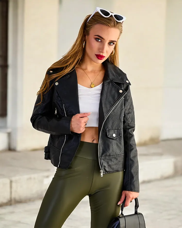 - Unikāla sieviešu jaka Ramones, kas izgatavota no mīkstas eko ādas - lieliska izvēle pavasarim! Modelis ar rāvējslēdzēju, ir arī kabatas. PIEZĪME: mērījumu precizitāte (+/-) 1 cm.