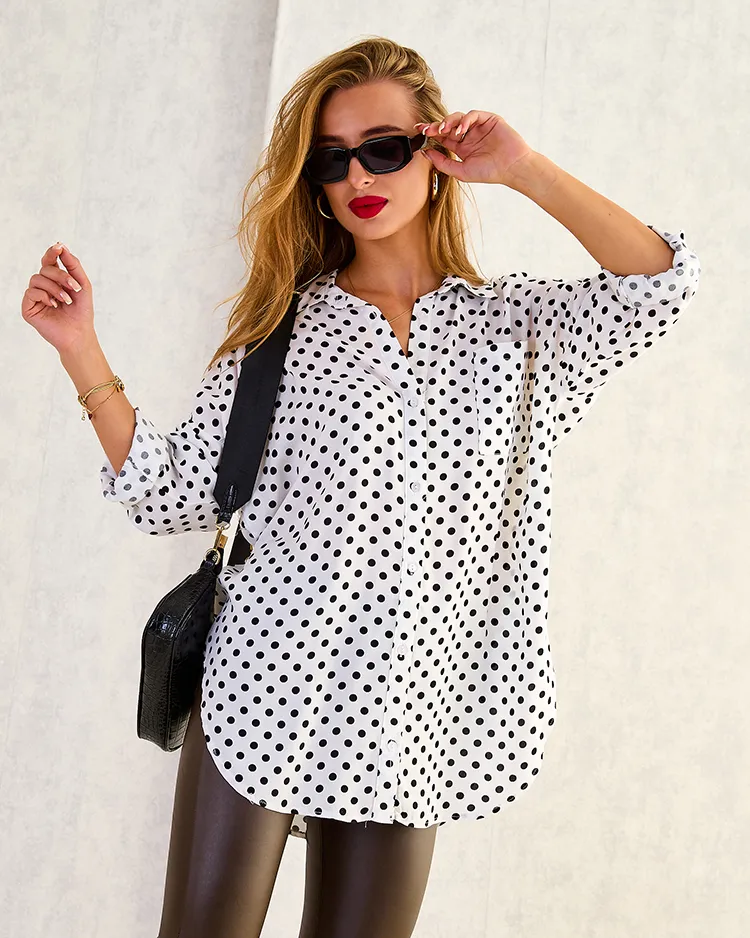 - Sensacionāls sieviešu polka punktiņu krekls ar saritināmām piedurknēm. Modelis ar apkakli, aizpogājams ar pogām. Obligāti jābūt ikvienas sievietes garderobē!
