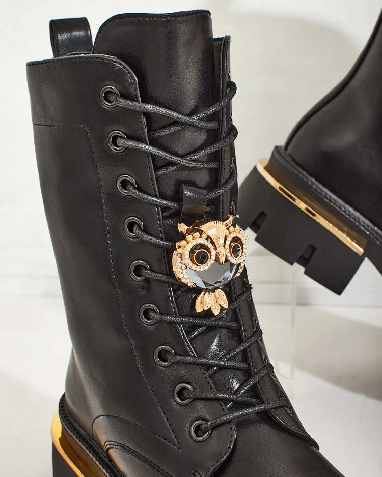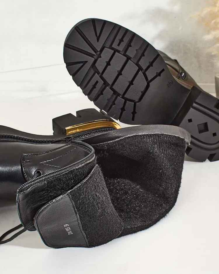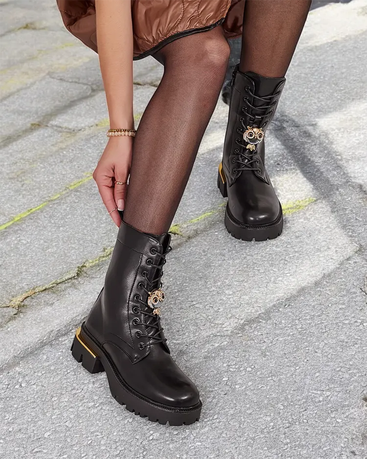 - Stilīgi bagger zābaki no eko ādas. Šiem zābakiem ir mežģīnes un rāvējslēdzēji, tiem ir biezāka gumijas zole un kažokādas zolīte. Apaviem ir dekoratīva augšdaļa. Lieliski piemērotas rudenim!