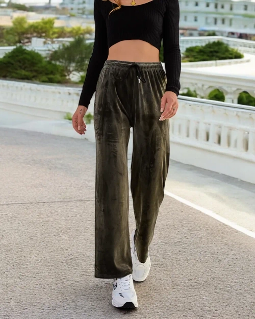 - Mīksta materiāla a'la velūrs bez laika. Modelim ir vienkāršs piegriezums, tam ir divas biksīšu kabatas un elastīga josta un bikses. Ideāla izvēle ikdienas valkāšanai!