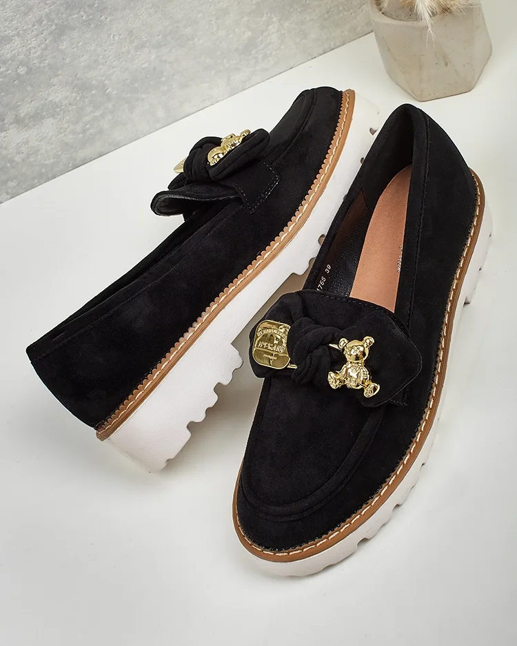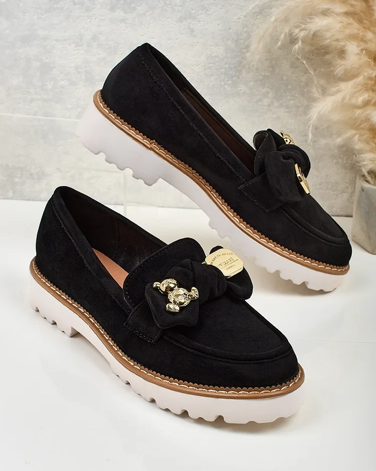 - Mokasini klasikë femrash në platformë të vogël. Modeli është bërë nga lëkurë ekologjike zamshe dhe shtrojë eko lëkure. Hunda e zbukuruar me fjongo. Duhet të jetë në dollapin e çdo gruaje!
