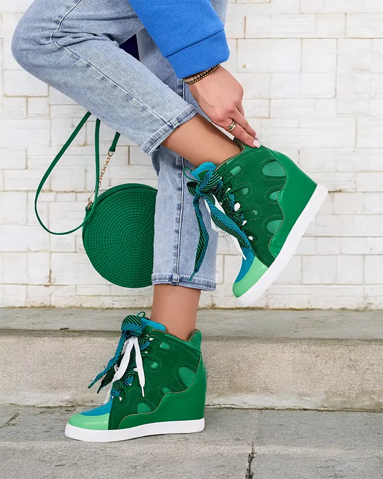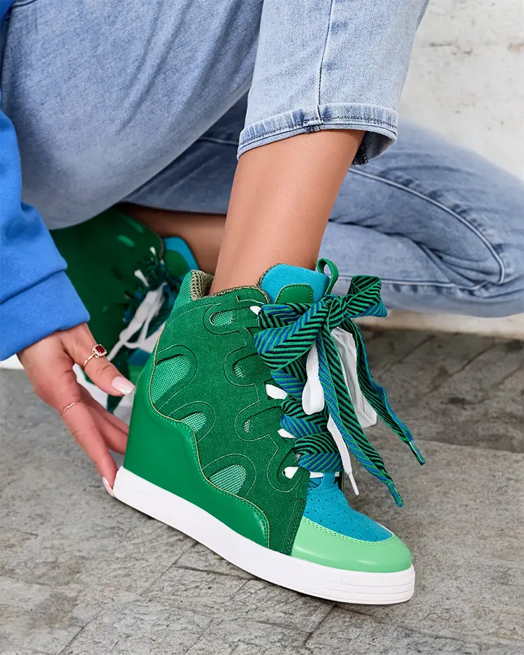- Sportiski sieviešu zābaki uz papēžiem, kas izgatavoti no eko ādas un eko zamšādas kombinācijas. Apavi sasieti ar dekoratīvām aukliņām, iekšpusē ekoādas zolīte.