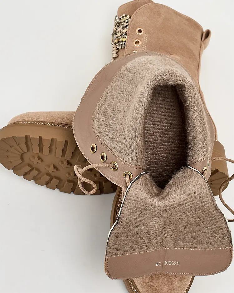 - Stilīgi bagger zābaki, kas izgatavoti no eko zamšādas. Apaviem ir mežģīnes, biezāka gumijas zole un auduma zolīte. Apaviem ir ornaments uz augšdaļas. Lieliski piemērotas rudenim!