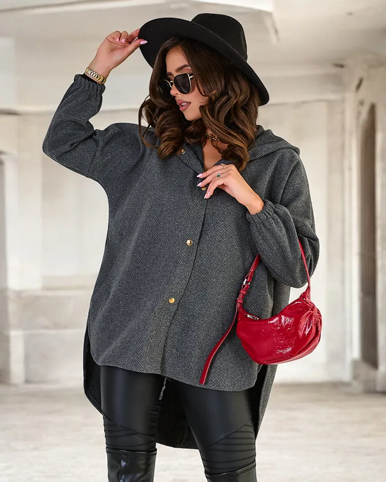 • Oriģināla sieviešu jaka ar kapuci. Modelim ir garas piedurknes, kas pabeigtas ar gumijām labākai piegulēšanai un valkāšanas komfortam. Ideāls piedāvājums rudenim! Modelim nav oderes. PIEZĪME: mērījumu precizitāte (+/-) 1 cm.