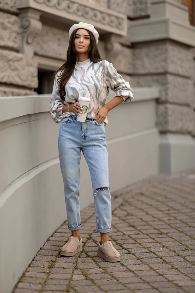 - Sieviešu džemperis ar apaļu izgriezumu, kas izgatavots no patīkama auduma ar apdruku. Modelim ir garas piedurknes. Lieliska bāze ziemas tērpiem!