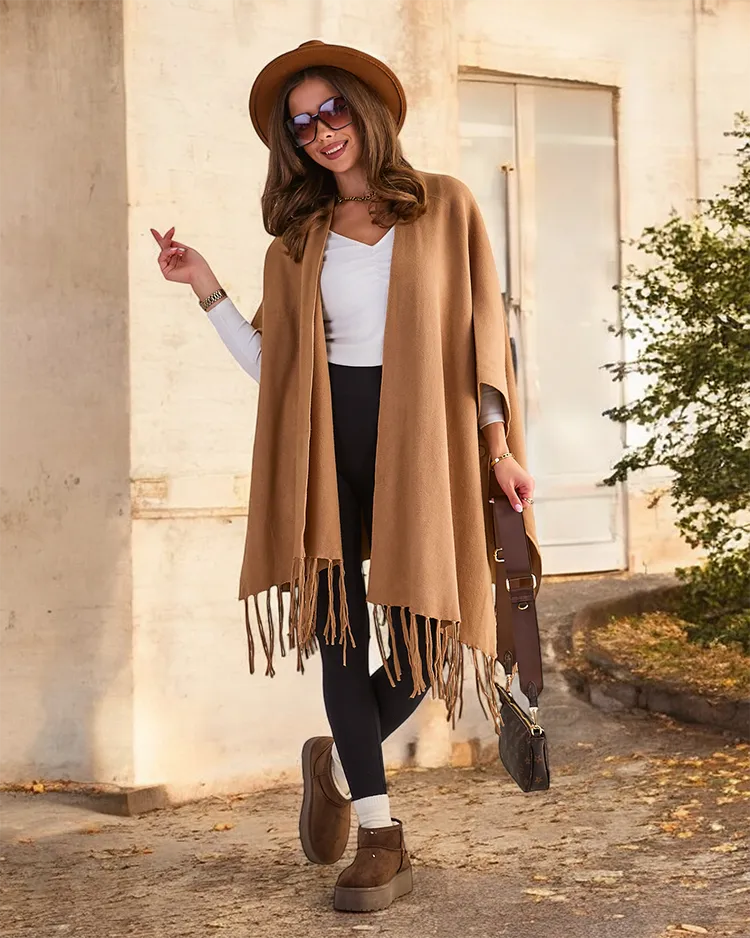- Elegants sieviešu pončo ar dekoratīviem pušķiem. Mīksts materiāls, siltums un stils vienā. Lieliski piemērots jebkuram stilam. Pieejams dažādās krāsās.