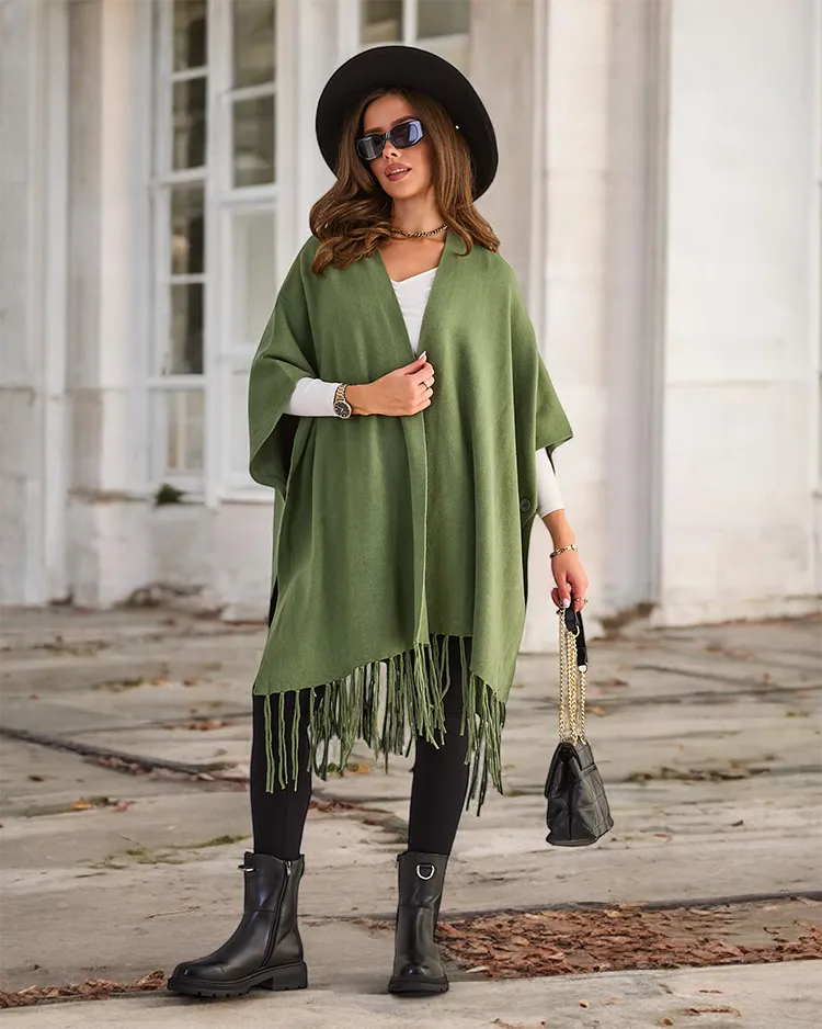 • Elegants sieviešu pončo ar dekoratīviem pušķiem. Mīksts materiāls, siltums un stils vienā. Lieliski piemērots jebkuram stilam. Pieejams dažādās krāsās.