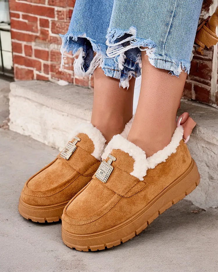 • Ocieplane damskie mokasyny na platformie. Klasyczny model wykonany z zamszowej skóry ekologicznej oraz wypełnienia a' la kożuszek. Podeszwa w formie platformy. Na cholewce nie zdejmowana ozdoba z cyrkoniami.