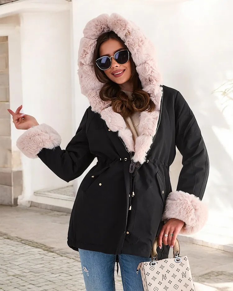 • Sieviešu, siltināts ziemas mētelis ar kapuci un noņemamu ādas apmales apdari. Modelis pievienots ar rāvējspiedi un spraudniem, ir 2 kabatas un šņoras, kas uzsver vidukli. Ideāli piemērots vēsākiem dienām!