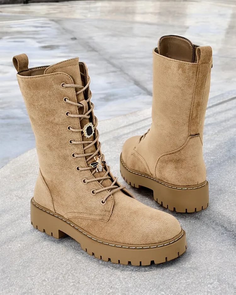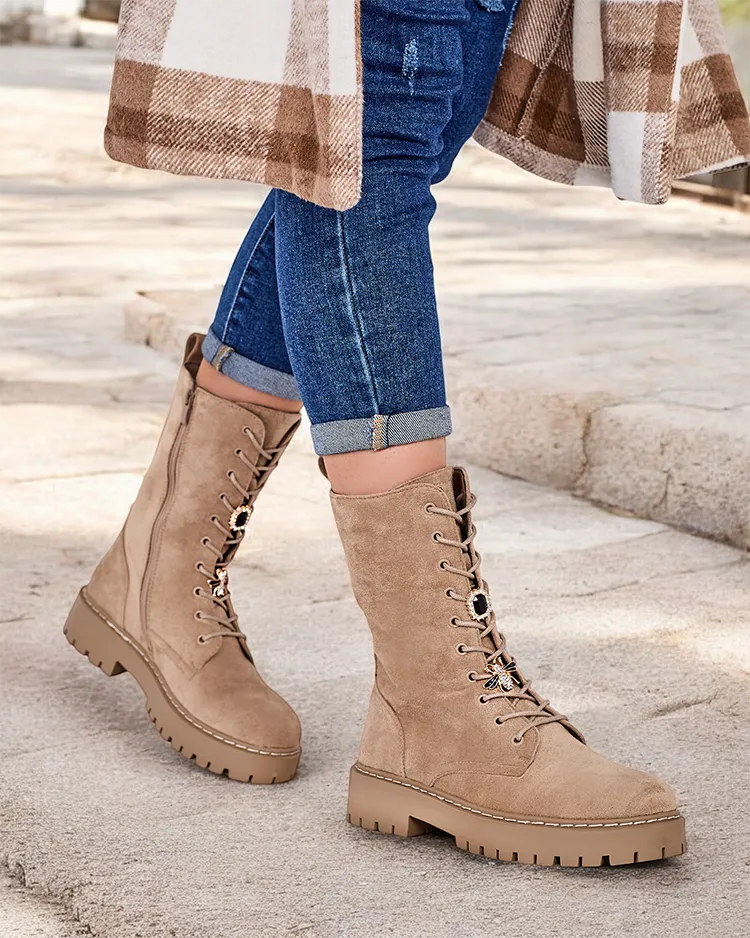 - Stils darbapdraudzīgi ķēžu zābaki, izgatavoti no mākslīgās zamšādas. Apavos ir ķēžu slēgšana un arī rāvēja aizvēršana. Modeļam ir biezāka zole un kazas apdare. Apavi tiek piegādāti ar noņemamiem dekoriem. Ideāli piemēroti rudens sezonai!