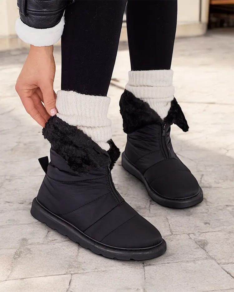 - Sieviešu sniega zābaki ar augšējo daļu, ko veido materiāls līdzīgs vaksētajai kokvilnai. Iekšpusē ir kažoka izšuvums, un apavos ir rāvējslēdzis vidū. Ideāli piemēroti aukstākiem gada laikiem!